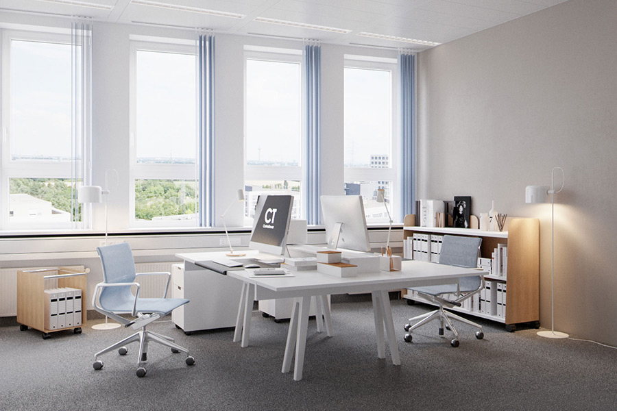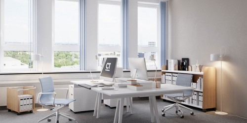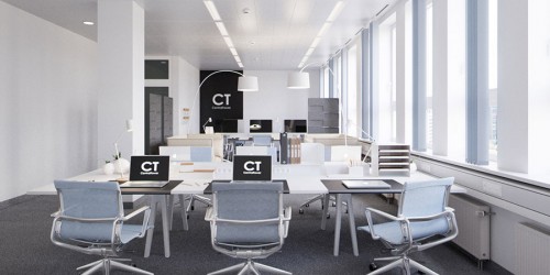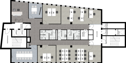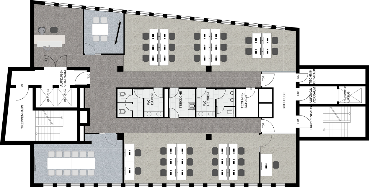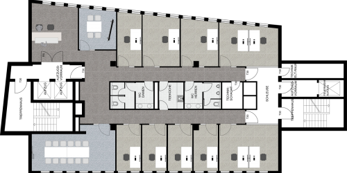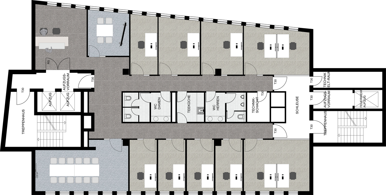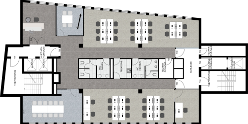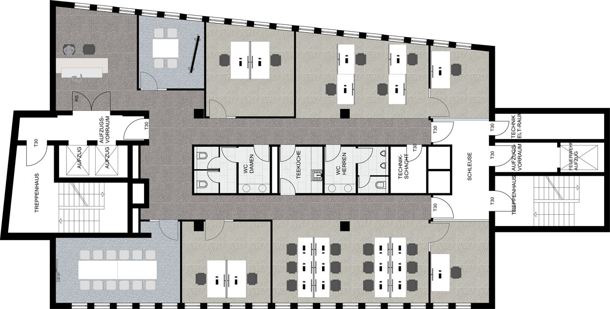 Effizienter Grundriss mit der Möglichkeit einer flexiblen Nutzung der Büroetagen. Gestaltungsmöglichkeiten von klassischen Einzelbüro bis zum Open Space Konzept für beste innerbetriebliche Kommunikationsmöglichkeiten.